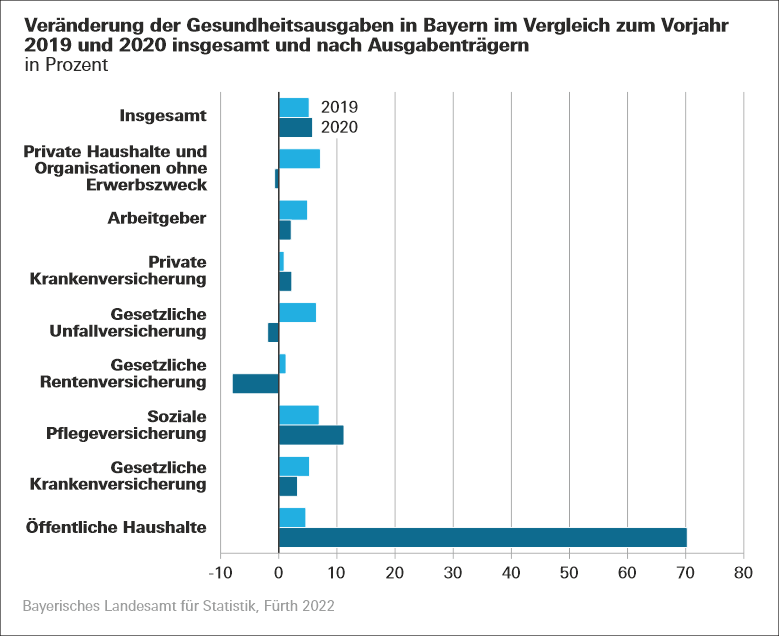 Neben der durch Corona bedingten Erhöhung der Ausgaben insbesondere bei den öffentlichen Haushalten ist im Jahr 2020 auch eine Verschiebung der Ausgaben auf andere Ausgabenträger zu beobachten: So sinken etwa die Kosten, die in Bayern durch die gesetzliche Unfall- bzw. Rentenversicherung getragen werden, um rund zwei bzw. acht Prozent. Zugleich ist bei der sozialen Pflegeversicherung ein im Vergleich zum Vorjahr deutlicher Anstieg der Ausgaben um 11,2 Prozent zu verzeichnen.