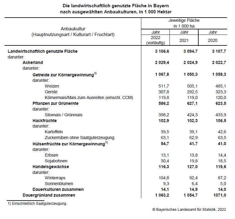 Nach den vorläufigen Ergebnissen der Bodennutzungshaupterhebung 2022 werden in Bayern rund 3 106 600 Hektar landwirtschaftlich genutzte Fläche, darunter 2 029 400 Hektar Ackerland, bewirtschaftet. Mit 511 700 Hektar liegt die Anbaufläche für Weizen mit einem Anstieg um ein Prozent geringfügig über dem Vorjahresniveau. Die Anbaufläche für Gerste steigt um etwa fünf Prozent auf 307 800 Hektar. Wenngleich auf noch niedrigem Niveau, gewinnen die Anbauflächen für Sojabohnen (+53,5 Prozent) und Sonnenblumen (+45,3 Prozent) aktuell stark an Bedeutung.