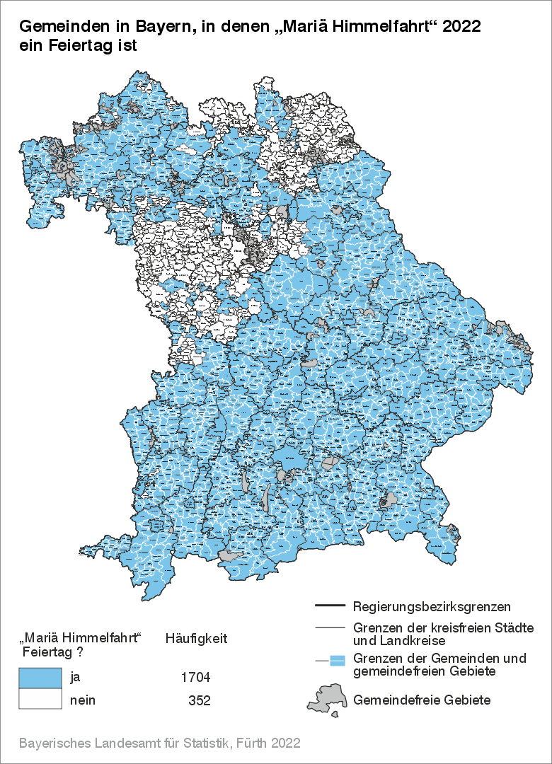 Die Festlegung, in welchen Gemeinden Bayerns „Mariä Himmelfahrt“ ein gesetzlicher Feiertag ist, beruht auf den Ergebnissen des Zensus 2011. Nach Mitteilung des Bayerischen Landesamts für Statistik ist das Fest „Mariä Himmelfahrt“ in 1 704 von insgesamt 2 056 Gemeinden Bayerns ein gesetzlicher Feiertag. In Oberbayern und Niederbayern ist der 15. August 2022 überall Feiertag, da dort in allen Gemeinden zum Zeitpunkt des Zensus 2011 die Zahl der Katholiken jeweils in den Regionen überwog.