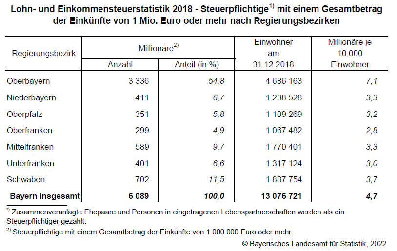 Insgesamt kamen im Jahr 2018 in Bayern im Durchschnitt 4,7 Einkommensmillionäre auf 10 000 Einwohner, im Jahr 2017 waren es 4,4. Die höchste Millionärsdichte gab es im Landkreis Starnberg mit 22,2 Einkommensmillionären je 10 000 Einwohner. Es folgten der Landkreis München mit 13,2, der Landkreis Miesbach mit 10,4, die Stadt München mit 9,9 und die kreisfreie Stadt Memmingen mit 8,7 Einkommensmillionären je 10 000 Einwohner.