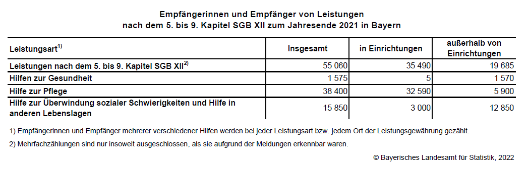 Nach Angaben des Bayerischen Landesamts für Statistik erhalten am Stichtag 31.12.2021 bayernweit 55 060 Personen Leistungen nach dem 5. bis 9. Kapitel Sozialgesetzbuch XII (SGB). Zu rund 65 Prozent werden die Leistungen in Einrichtungen erbracht. Hilfe zur Pflege stellt mit 38 400 Empfängerinnen und Empfängern den größten Leistungsblock dar.