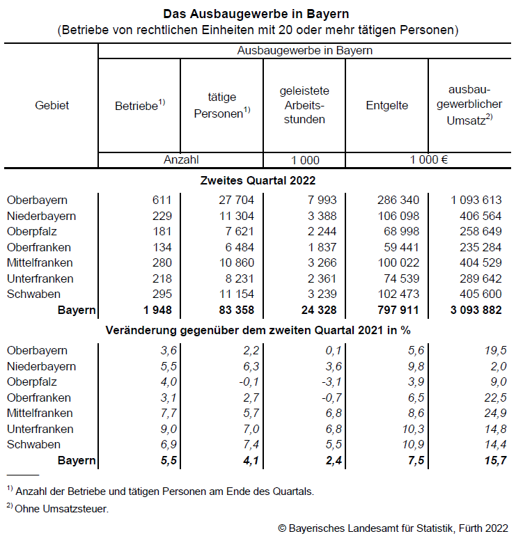 Den größten Anteil des im bayerischen Ausbaugewerbe im zweiten Quartal 2022 erwirtschafteten ausbaugewerblichen Umsatzes steuern die in Oberbayern ansässigen Betriebe des Wirtschaftssektors bei: insgesamt 1,09 Milliarden Euro beziehungsweise 35,3 Prozent und ein Plus von 19,5 Prozent gegenüber Vorjahresquartal.