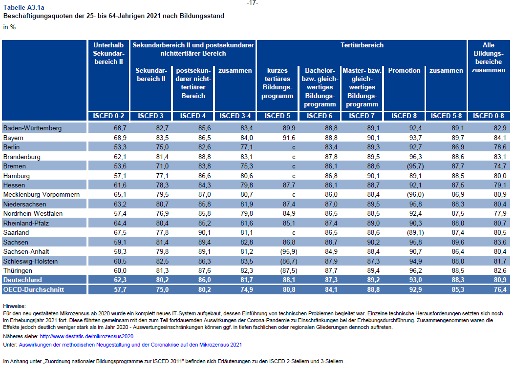 So zeigt der Indikator „Beschäftigungsquoten nach Bildungsstand“ für das Jahr 2021, dass Bayern in Deutschland und auch international weiterhin eine Spitzenposition belegt. Während über alle Bildungsbereiche zusammen 84,1 Prozent der Bayern im erwerbsfähigen Alter beschäftigt sind, liegt der Bundesdurchschnitt bei 80,9 Prozent, der OECD-Durchschnitt bei 76,4 Prozent. Bei einem tertiären Ausbildungsabschluss, wie zum Beispiel „Master“ liegt die Beschäftigungsquote in Bayern bei 90,1 Prozent.