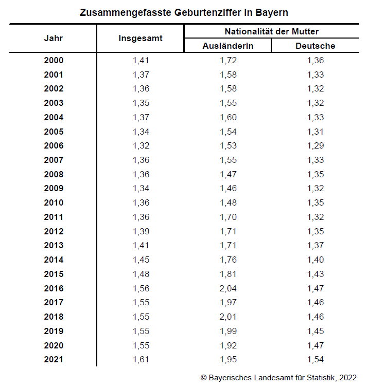 Mit 1,61 Kindern je Frau erreicht die zusammengefasste Geburtenziffer (engl. Total Fertility Rate; TFR) in Bayern im Jahr 2021 den höchsten Wert nach 1972. Eine höhere durchschnittliche Kinderzahl je Frau gab es zuletzt 1972 mit einer TFR bei 1,73 Kinder je Frau. Im Vergleich zum Vorjahr ist der Wert deutlich gestiegen, so liegt die zusammengefasste Geburtenziffer im Freistaat im Jahr 2020 noch bei 1,55 Kinder je Frau. Ein Anstieg der TFR gegenüber dem Vorjahr ist auch für jeden Regierungsbezirk sowie 73 der 96 kreisfreien Städte und Landkreise erkennbar.