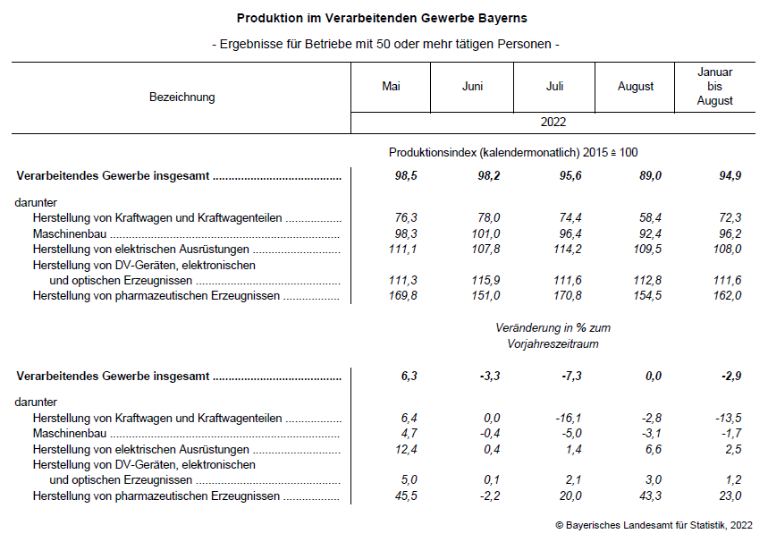Nach Angaben des Bayerischen Landesamts für Statistik bleibt die Produktion des Verarbeitenden Gewerbes in Bayern im August 2022 gegenüber dem Vorjahresergebnis konstant. Die ersten acht Monate des Jahres 2022 ergeben hingegen ein Minus von 2,9 Prozent.