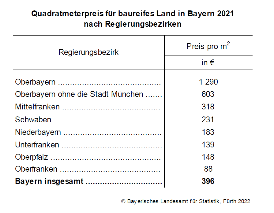 Der Quadratmeterpreis für die Verkäufe von baureifem Land beläuft sich in Bayern im Jahr 2021 im Durchschnitt auf 396 Euro. Dabei bestehen zwischen den einzelnen Regierungsbezirken große Preisunterschiede. Mit einem Preis von 1 290 Euro je Quadratmeter ist baureifes Land im Regierungsbezirk Oberbayern am teuersten. Der niedrigste Preis liegt hingegen in Oberfranken vor; im Durchschnitt werden dort für einen Quadratmeter baureifes Land nur 88 Euro bezahlt.