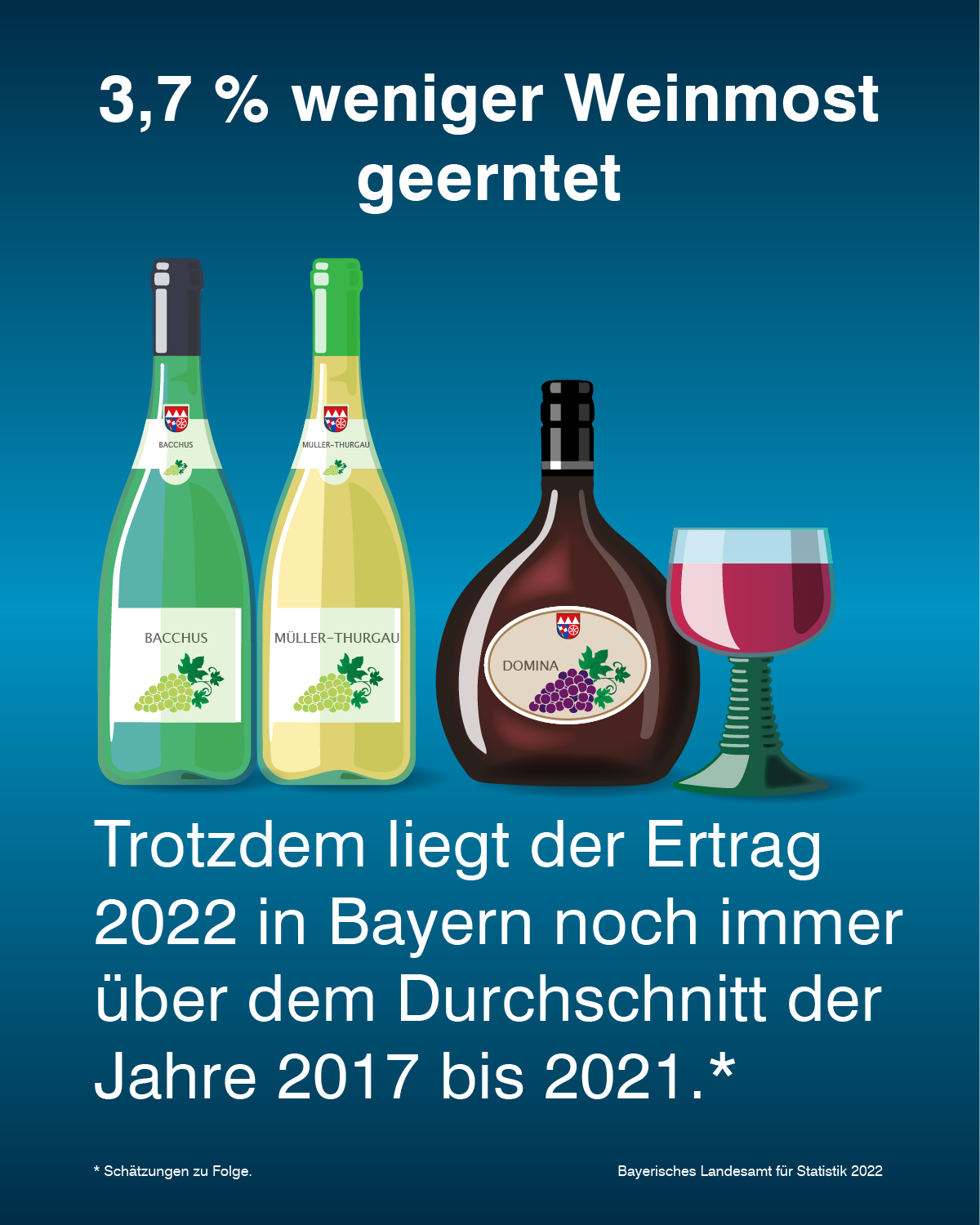 Der bayerische Weinanbau ist fast ausschließlich im Weinanbaugebiet Franken beheimatet. Hier werden 98,4 Prozent (422 600 hl) des Weinmostes geerntet. Nach Schätzungen der Weinberichterstatter beläuft sich die Erntemenge bei Weißweinrebsorten auf rund 355 800 hl und bei Rotweinrebsorten auf rund 73 600 hl. Dies bedeutet einen Rückgang beim Weißmost um 21 700 hl bzw. 5,8 Prozent sowie eine Zunahme um 5 000 hl bzw. 7,3 Prozent beim Rotmost.