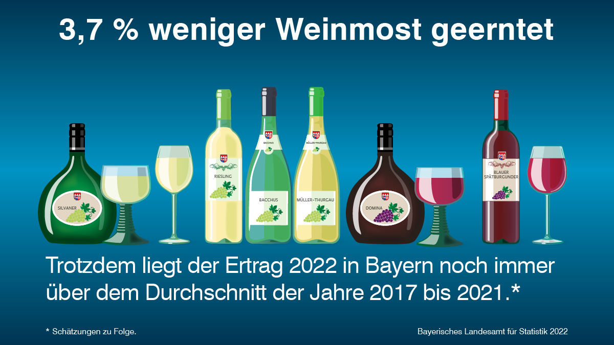 Die aktuellen, noch vorläufigen Ergebnisse liefern Näherungswerte zur bayerischen Weinmosternte 2022. Das endgültige Ergebnis liegt im März 2023 vor.