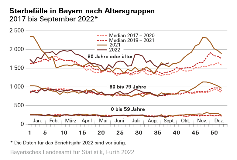 Statistik. Damit liegt die Zahl der gesamten Sterbefälle im Freistaat gut neun Prozent über dem Niveau des Medians* der Jahre 2018 bis 2021 mit 10 357 Verstorbenen.