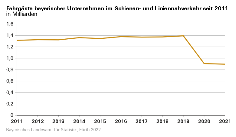 Fahrgäste. Damit liegt das Fahrgastaufkommen 2021 nochmals um 1,1 Prozent unter dem Ergebnis aus dem ebenfalls von Corona schwer betroffenen Vorjahr 2020. Im Jahr 2019, vor der Corona-Pandemie, wurden mit knapp 1,4 Milliarden noch über ein Drittel mehr Fahrgäste von den bayerischen Unternehmen befördert.