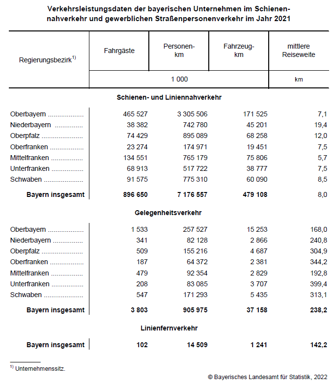 Die Fahrleistung der bayerischen Unternehmen im Schienennahverkehr und im gewerblichen Straßenpersonenverkehr liegt 2021 bei gut 517,5 Millionen Kilometern (+4,7 Prozent ggü. 2020, -21,6 Prozent ggü. 2019). Davon entfallen 92,8 Prozent der Fahrzeugkilometer auf den Liniennah- und Linienfernverkehr, 7,2 Prozent auf den Gelegenheitsverkehr.