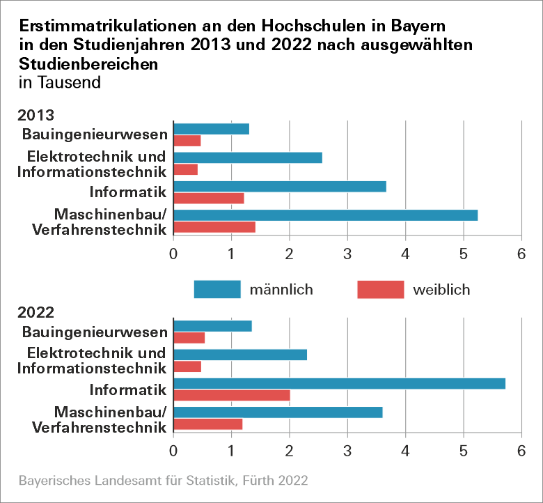 Im Zehnjahresvergleich hat sich in Bayern die Zahl der Immatrikulierten um 22,2 Prozent erhöht. Im Wintersemester 2012/13 studierten 332 764 Personen an den Hochschulen in Bayern.