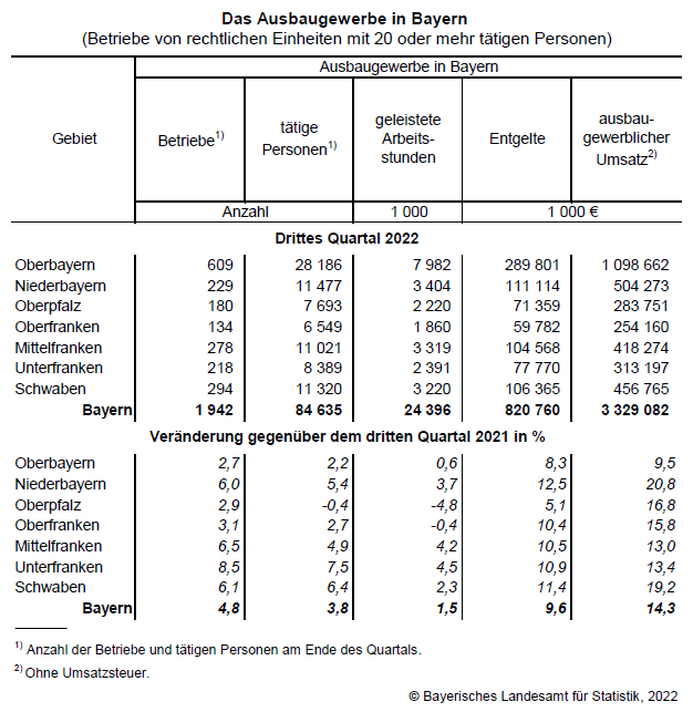 Im dritten Quartal 2022 erzielt das Ausbaugewerbe im Freistaat einen ausbaugewerblichen Umsatz in Höhe von 3,3 Milliarden Euro. Das ist ein nominales Plus von 14,3 Prozent gegenüber dem Vorjahresquartal, so die Fachgruppe im Bayerischen Landesamt für Statistik.