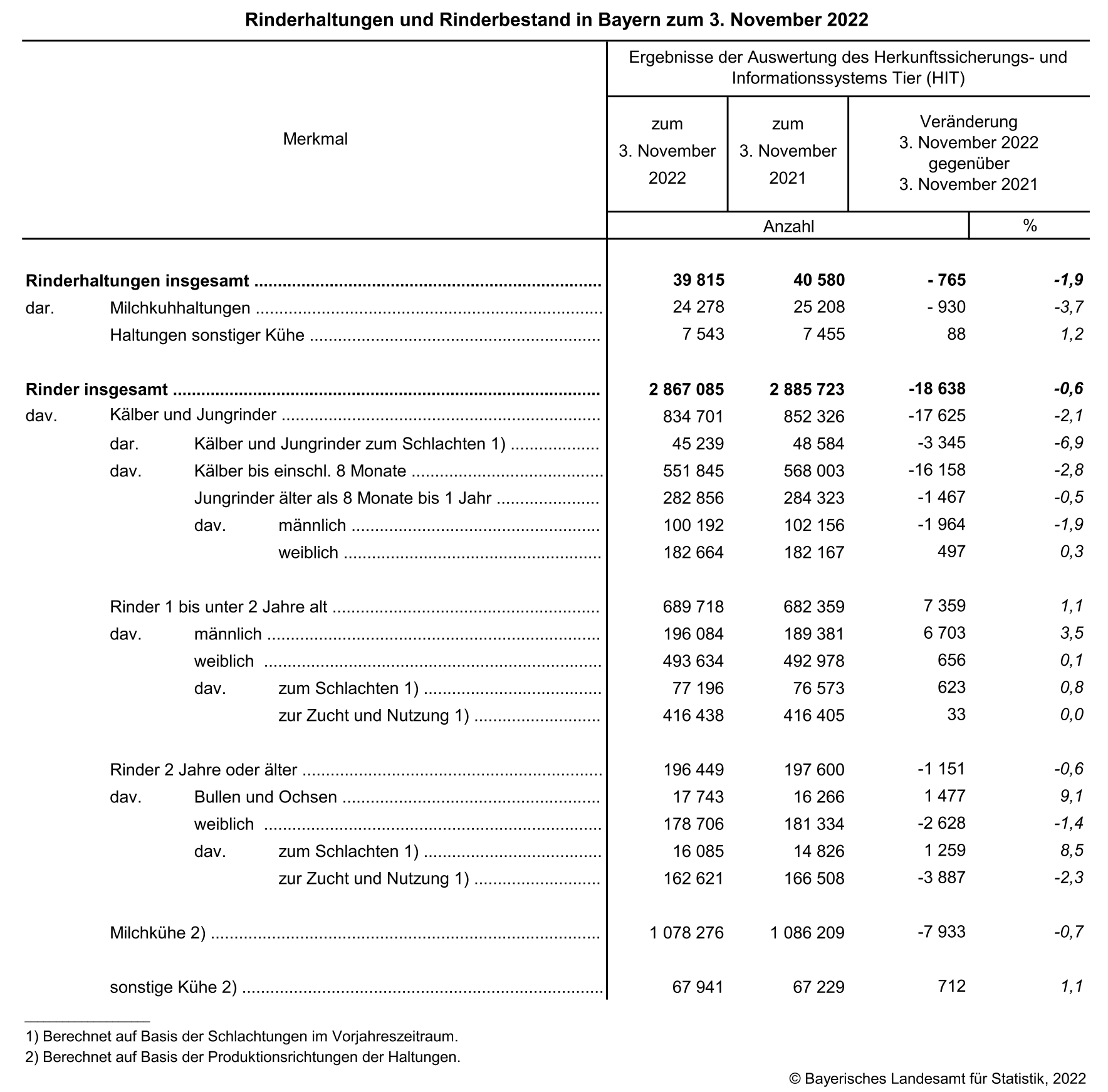 Den größten Anteil (37,6 Prozent) am Rinderbestand haben die Milchkühe mit insgesamt 1 078 276 Tieren, das sind 0,7 Prozent (-7 933 Tiere) weniger als im Vorjahr. Dem allgemeinen Trend in der Landwirtschaft folgend, geht die Zahl der entsprechenden Haltungen noch ein wenig stärker zurück, und zwar um 3,7 Prozent (-930 Haltungen) auf 24 278 Milchkuhhaltungen am Stichtag 3. November 2022. Größere prozentuale Zuwächse können innerhalb der für die Schlachtung vorgesehenen Rinderbestände verzeichnet werden. So nimmt die Zahl der Bullen und Ochsen um 9,1 Prozent auf einen Bestand von nun 17 743 Rinder zu. Es folgen die weiblichen Rinder zum Schlachten mit einem Alter von 2 Jahren oder mehr. Hier wächst der Bestand um 8,5 Prozent auf 16 085 Tiere an.