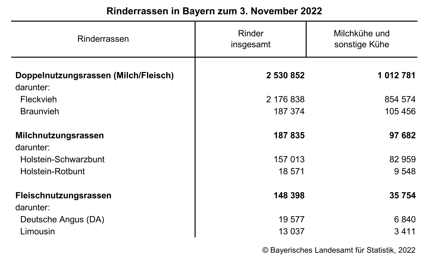 Mehr als drei Viertel der in Bayern gehaltenen Rinder zählen zum Fleckvieh (2 176 838 Rinder), somit ist diese Doppelnutzungsrasse (Milch/Fleisch) in Bayern dominierend. Mit 187 374 Tieren folgt mit großem Abstand das Braunvieh, eine weitere Zweinutzungsrasse. Insgesamt werden 2 530 852 Rinder einer Doppelnutzungsrasse zugerechnet. Die zu den Milchnutzungsrassen zählenden Holstein-Schwarzbunt werden mit 157 013 Tieren am dritthäufigsten gehalten. Insgesamt zählen 187 835 Rinder in Bayern zu den Milchnutzungsrassen, weitere 148 398 Rinder zu den Fleischnutzungsrassen.