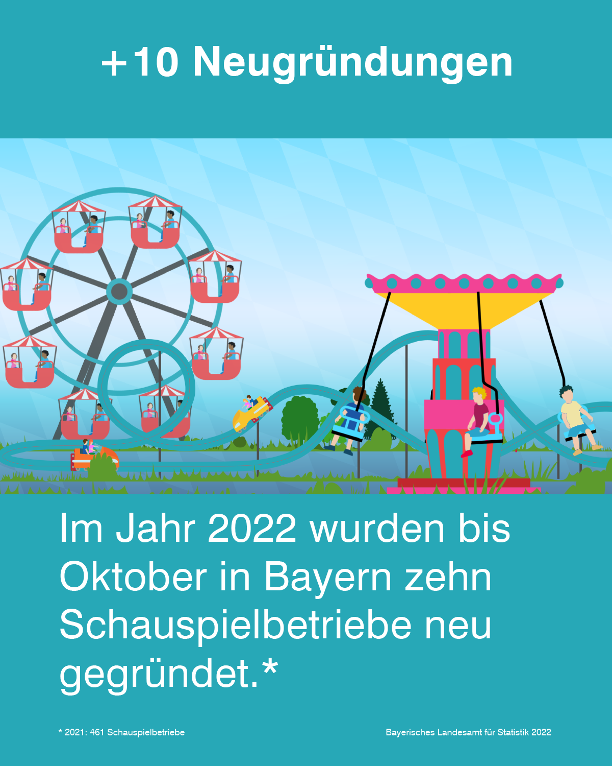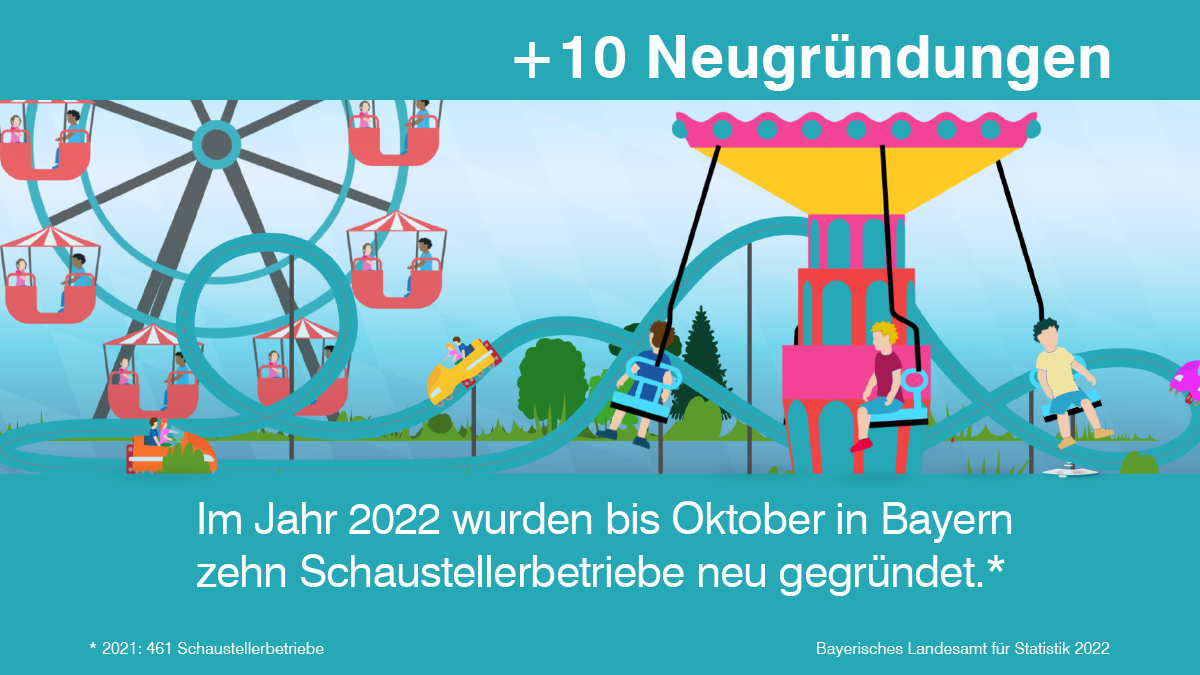 Wie das Bayerische Landesamt für Statistik mitteilt, gibt es in Bayern im Jahr 2021 insgesamt 461 Schaustellerbetriebe. Vor der Corona-Pandemie waren es in Bayern im Jahr 2019 noch 636 Schaustellerbetriebe. Nach den aktuellen Angaben der Gewerbeämter wurden im Jahr 2021 wieder zehn Gewerbe im Wirtschaftszweig „Vergnügungs- und Themenparks“ neu gegründet, im Jahr 2022 sind es bis Oktober nochmal zehn weitere Niederlassungen.