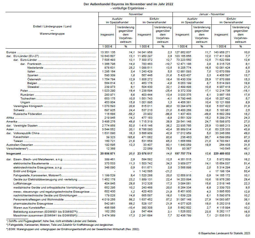 Werte der Ex- und Importe erreichen im bayerischen Außenhandel bis November 2022 neue Höchststände