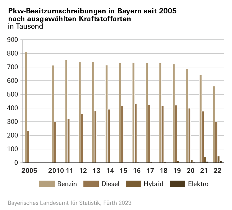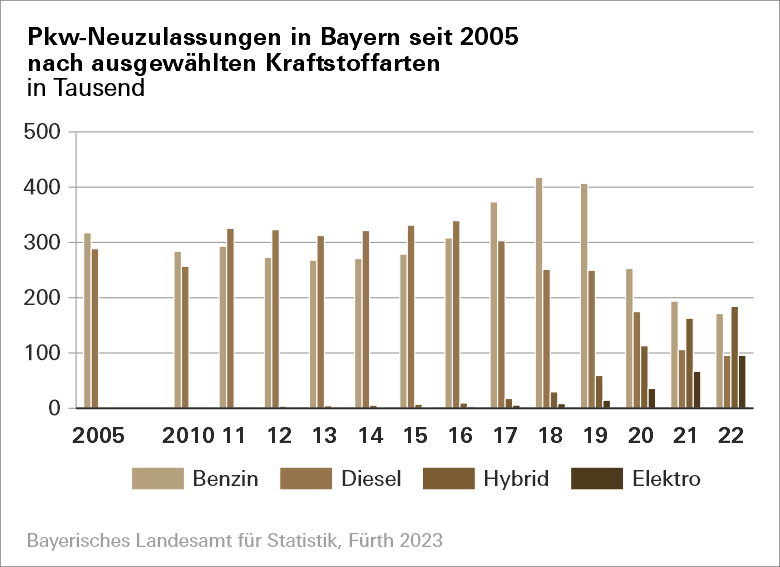 Nach der aktuellen Auswertung der Statistik des Kraftfahrt-Bundesamtes zählt das Bayerische Landesamt für Statistik im Jahr 2022 in Bayern 665 818 neu zugelassene Kraftfahrzeuge (Kfz). Das sind 1,2 Prozent mehr als im Vorjahr 2021. Die Zulassungszahlen von Personenkraftwagen (Pkw) nehmen insgesamt um 3,4 Prozent auf 549 542 zu. Rückläufig sind hingegen die Neuanmeldungen für Pkw mit konventionellen Antriebsarten: Für Diesel-Pkw verringern sie sich um 9,9 Prozent auf 95 648, für Benziner sogar um 11,5 Prozent auf 171 410. Dagegen steigt die Beliebtheit von Pkw mit alternativen Antriebsarten (Gas, Elektro, Hybrid) weiter an. Die Zahl der Erstanmeldungen erhöht sich hier deutlich gegenüber 2021 und erreicht einen Anteil von 51,4 Prozent an allen neu zugelassenen Pkw.
