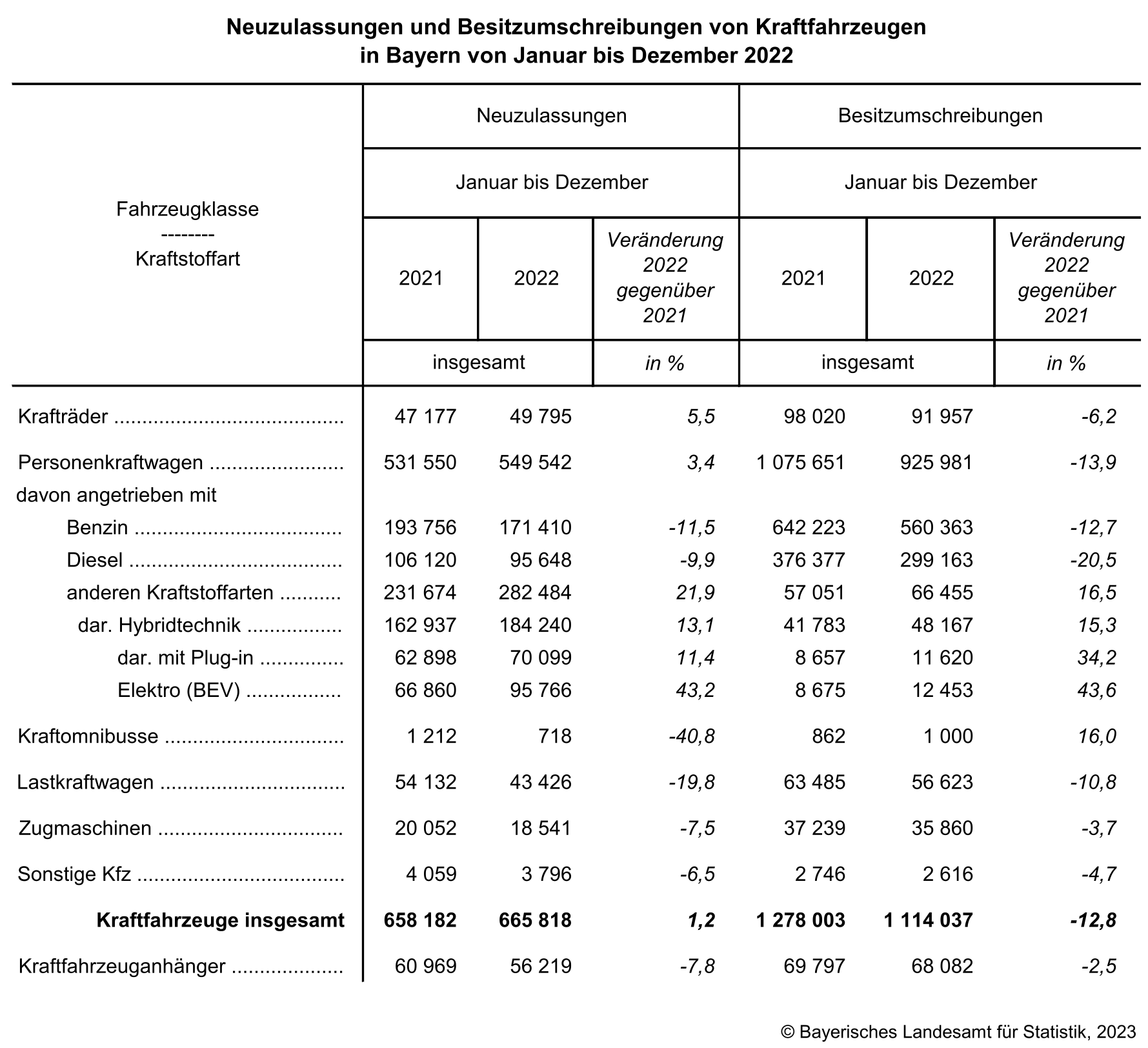 Fürth/Schweinfurt. Nach der Kraftfahrzeugstatistik des Kraftfahrt-Bundesamtes erhalten von Januar bis Dezember 2022 in Bayern 665 818 Kraftfahrzeuge (Kfz) ihre erstmalige Zulassung für den Straßenverkehr und damit 1,2 Prozent mehr als im Vorjahreszeitraum.