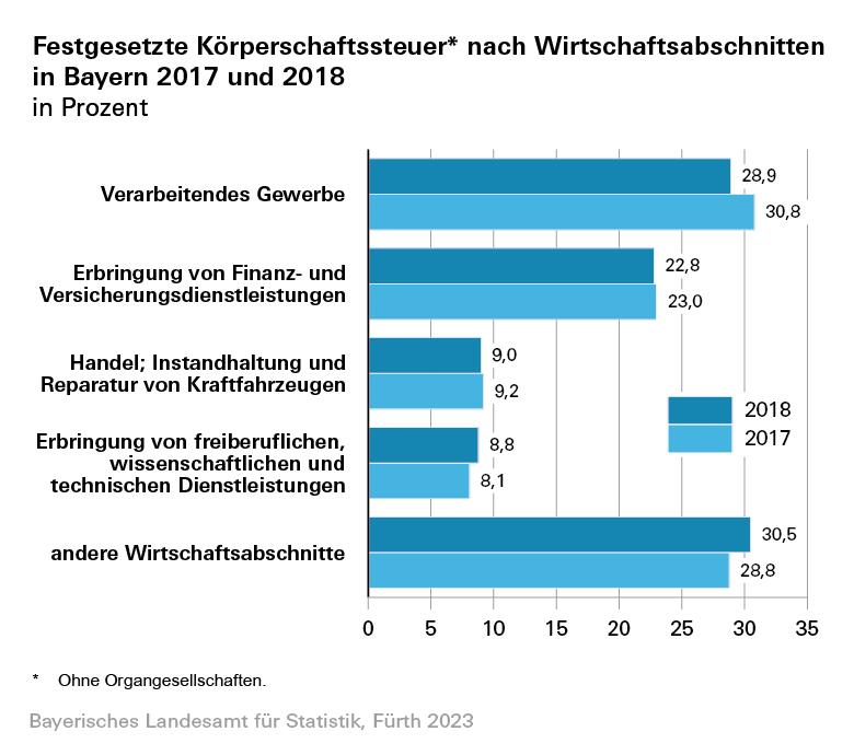 Der mit 28,9 Prozent bzw. 2,4 Milliarden Euro größte Anteil der in Bayern für 2018 festgesetzten Körperschaftsteuer entfiel auf den Wirtschaftsabschnitt „Verarbeitendes Gewerbe“. Es folgt der Wirtschaftsabschnitt „Erbringung von Finanz- und Versicherungsdienstleistungen“ mit einem Anteil von 22,8 Prozent bzw. 1,9 Milliarden Euro. Die nächstgrößten Anteile verzeichneten mit 9,0 Prozent (bzw. 742,1 Millionen Euro) der Wirtschaftsabschnitt „Handel; Instandhaltung und Reparatur von Kfz“, sowie der Bereich „Erbringung von freiberuflichen, wissenschaftlichen und technischen Dienstleistungen“ mit 8,8 Prozent (bzw. 730,8 Millionen Euro).