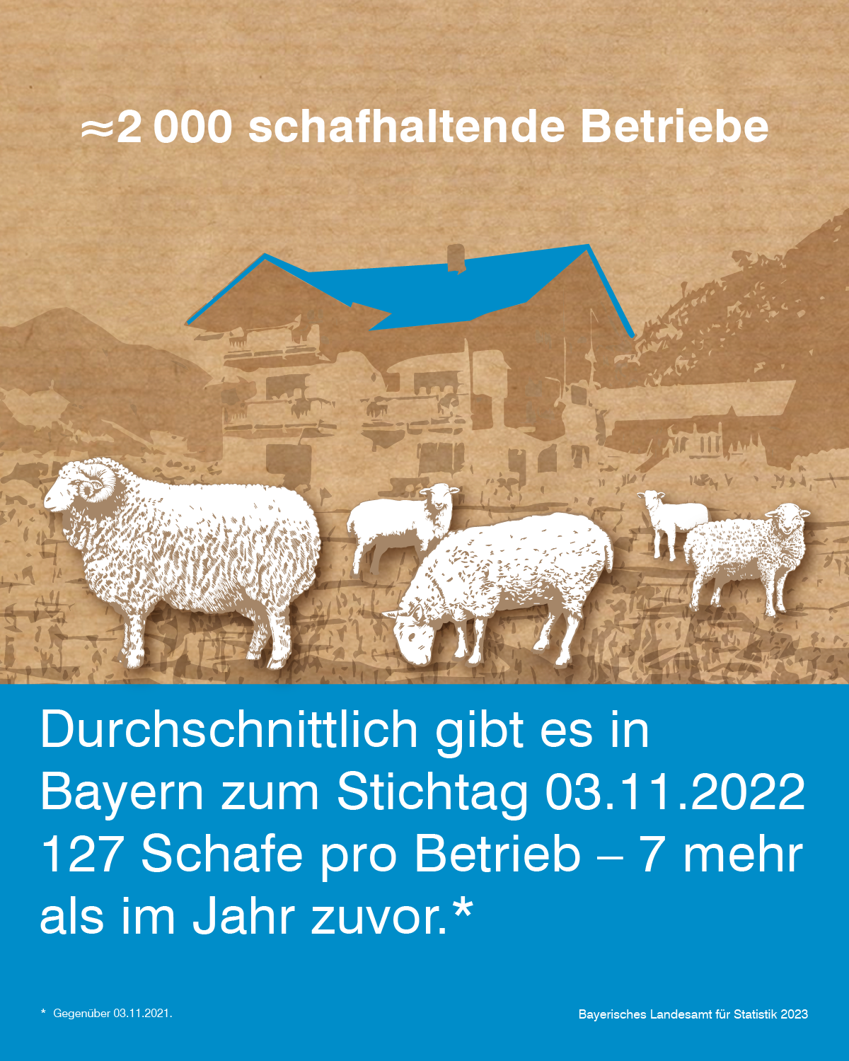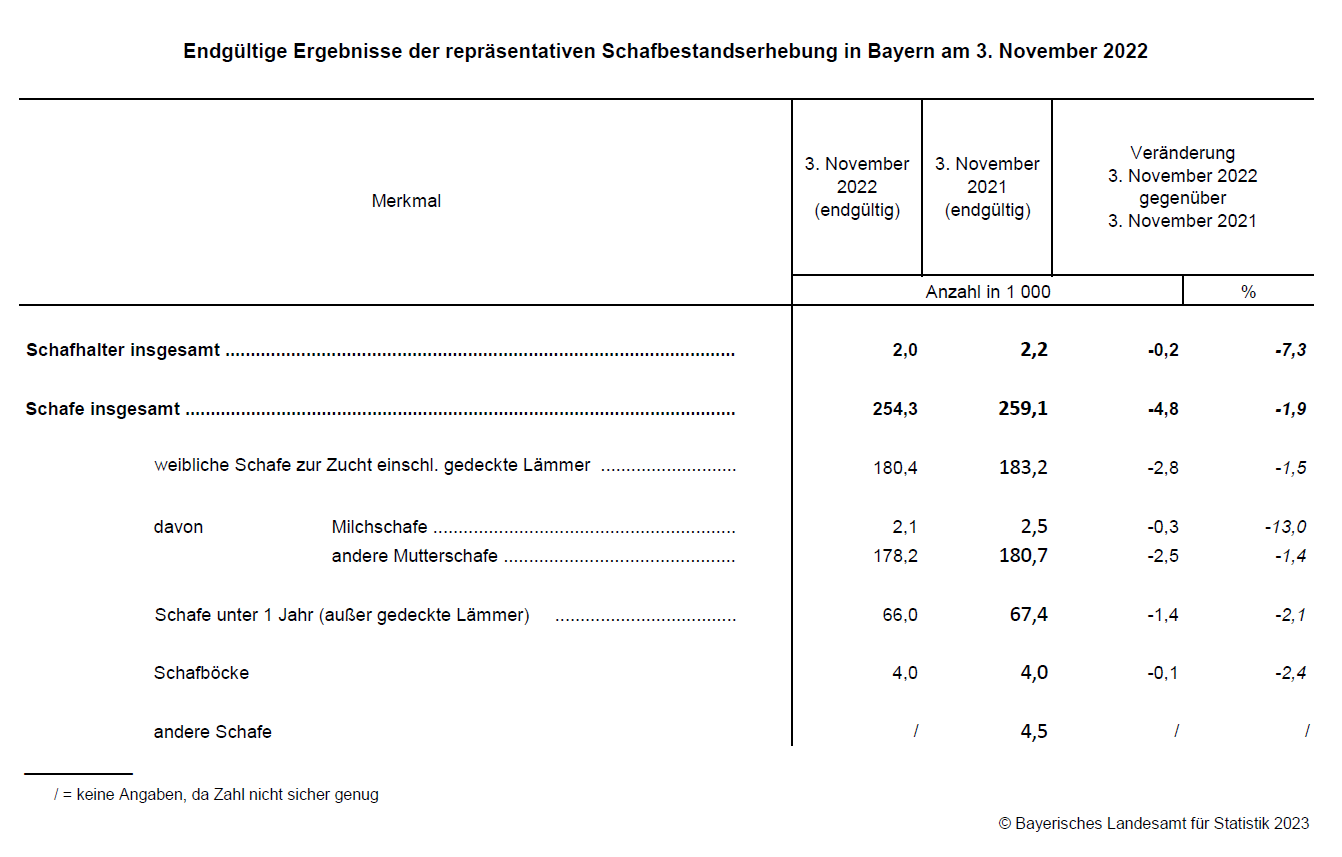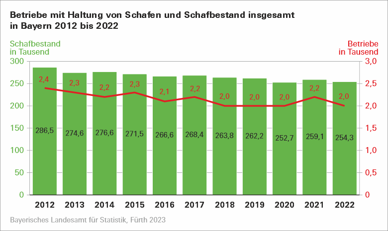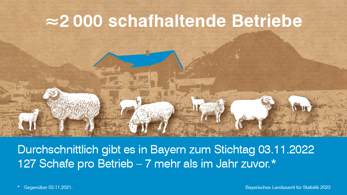 Nach den endgültigen Ergebnissen der vom Bayerischen Landesamt für Statistik durchgeführten Erhebung über die Schafbestände am 3. November 2022 sinkt die Zahl der Tiere auf rund 254 300, das entspricht einem Rückgang von 1,9 Prozent gegenüber dem Vorjahr. Gleichzeitig werden rund 2 000 schafhaltende Betriebe verzeichnet. Auf jeden Betrieb entfallen im Jahr 2022 durchschnittlich 127 Schafe und damit sieben mehr als im Jahr zuvor.