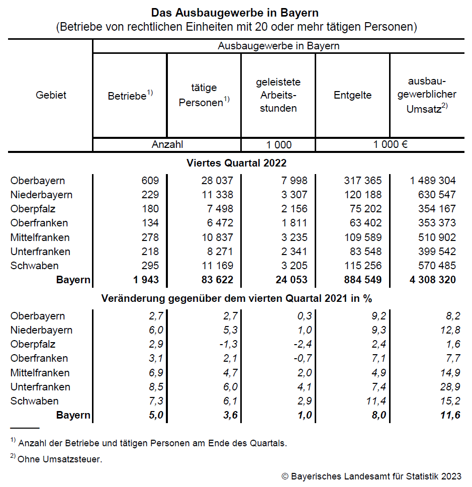 Bayerns Ausbaugewerbe im vierten Quartal 2022 mit nominalem Umsatzplus von 11,6 Prozent