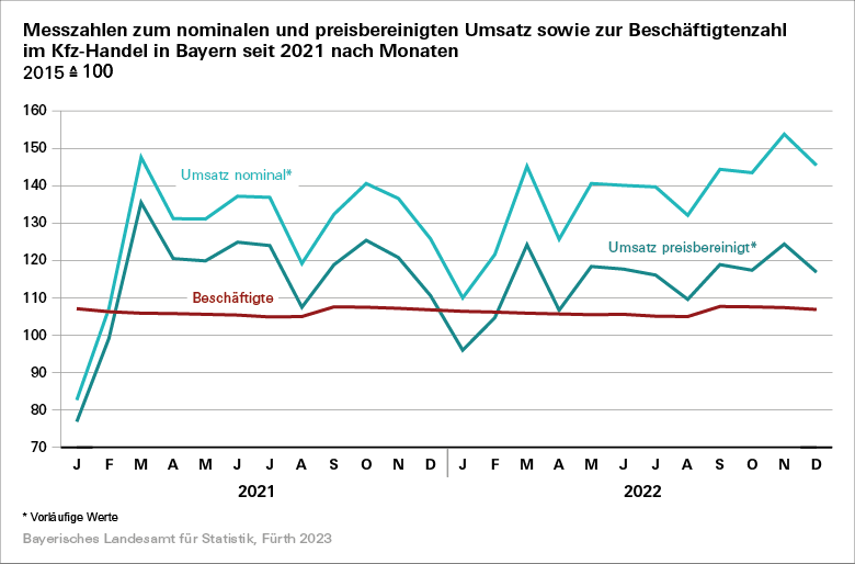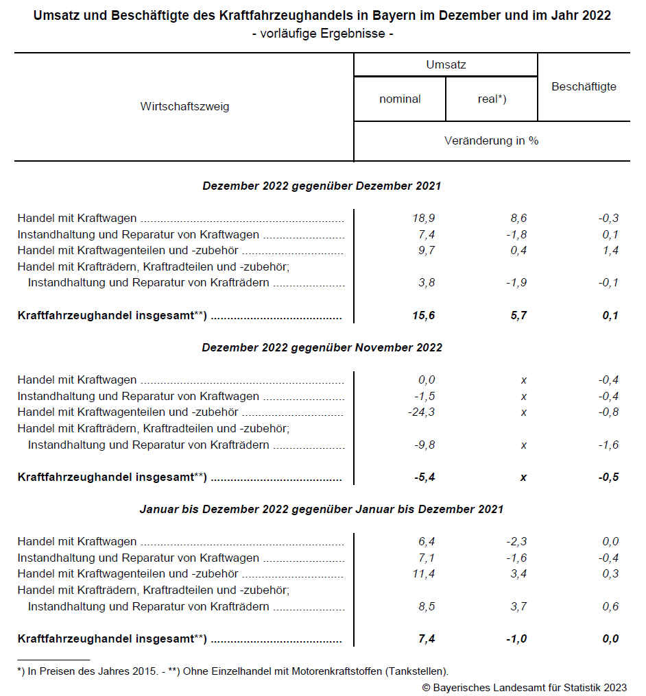 Im Dezember 2022 steigt der nominale Umsatz des Kfz-Handels in Bayern verglichen mit dem Dezember 2021 um 15,6 Prozent. Der reale Umsatz wächst um 5,7 Prozent. Gegenüber dem November 2022 sinkt der nominale Umsatz des Kfz-Handels in