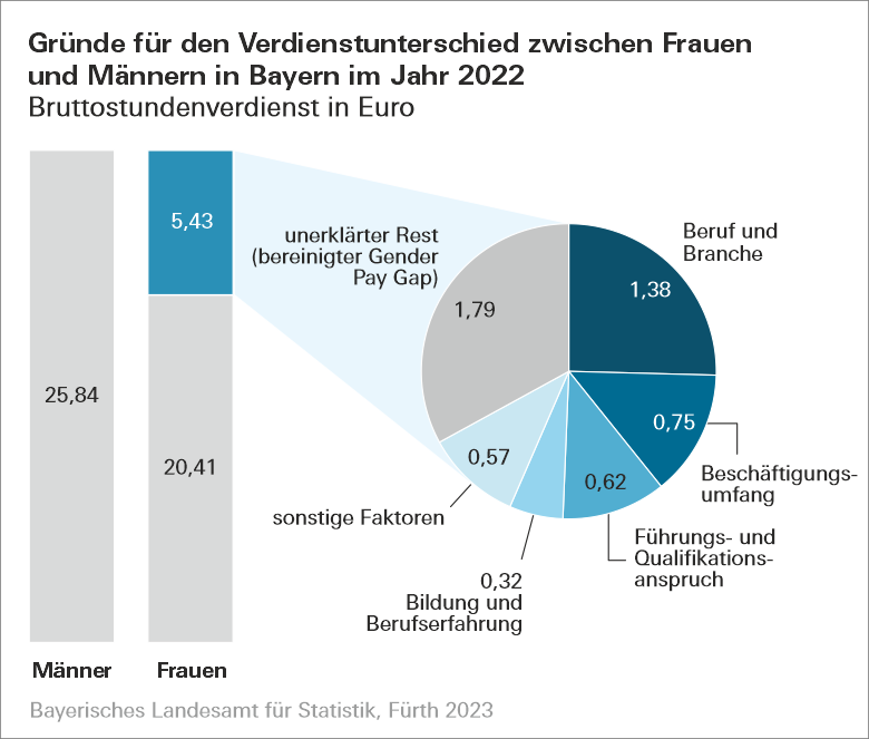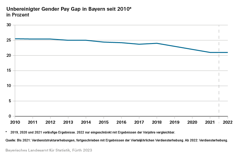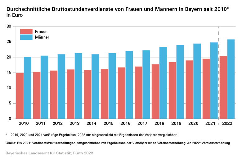 Nach den Ergebnissen der Verdiensterhebung 2022 beträgt der durchschnittliche Bruttostundenverdienst von Frauen in Bayern 20,41 Euro, der von Männern 25,84 Euro. Dadurch ergibt sich für Bayern im Jahr 2022 ein absoluter Verdienstunterschied in Höhe von 5,43 Euro. Der unbereinigte Gender Pay Gap liegt somit bei 21 Prozent.