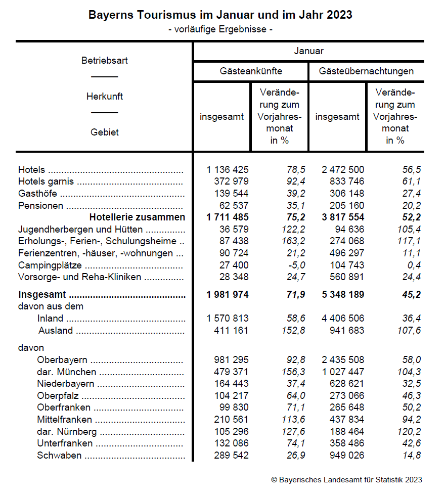 Zu Beginn des neuen Tourismusjahres meldet das Bayerische Landesamt für Statistik für die nahezu 10 800 geöffneten Beherbergungsbetriebe1) Bayerns rund 2,0 Millionen Gästeankünfte und gut 5,3 Millionen Übernachtungen. Somit kommen bereits im Januar 71,9 Prozent mehr Gäste nach Bayern und übernachten 45,2 Prozent häufiger als noch im Januar letzten Jahres.