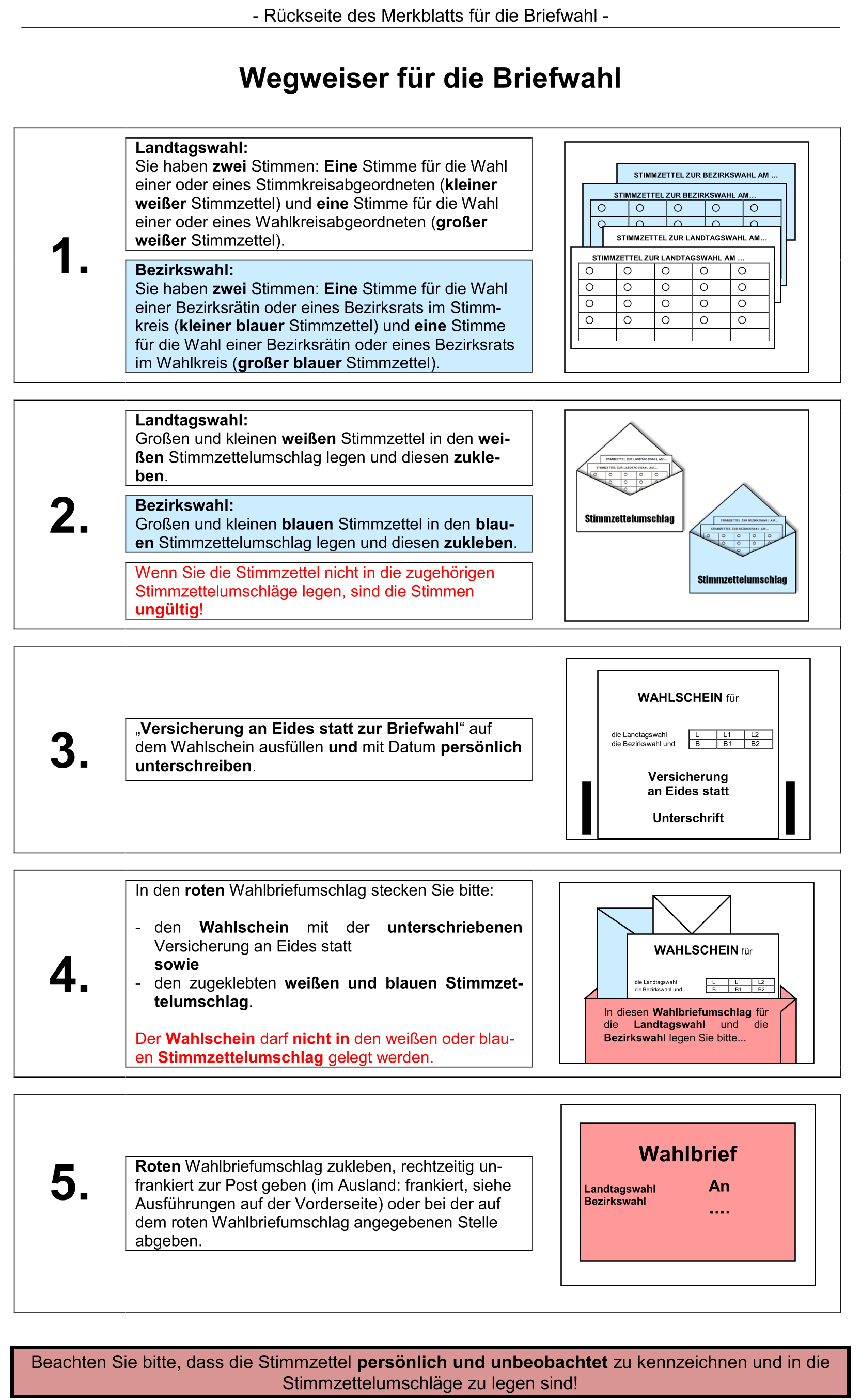 Der Wahlschein muss persönlich mit einer eidesstattlichen Versicherung versehen werden, dass die Stimmzettel persönlich gekennzeichnet wurden. Das Merkblatt bei den Briefwahlunterlagen und die Informationen auf der Website des Landeswahlleiters erläutern kurz das Vorgehen bei der Briefwahl.
