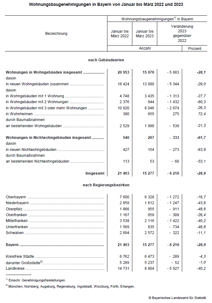 Mit Blick auf die bayerischen Kreise zeigt sich folgendes Stadt-Land-Gefälle: In den Landkreisen reduzieren sich die Wohnungsbaugenehmigungen um rund 40 Prozent und in den kreisfreien Städten um 4,3 Prozent. Für die acht bayerischen Großstädte ergibt sich insgesamt ein Rückgang des Genehmigungsvolumens um 1,0 Prozent.