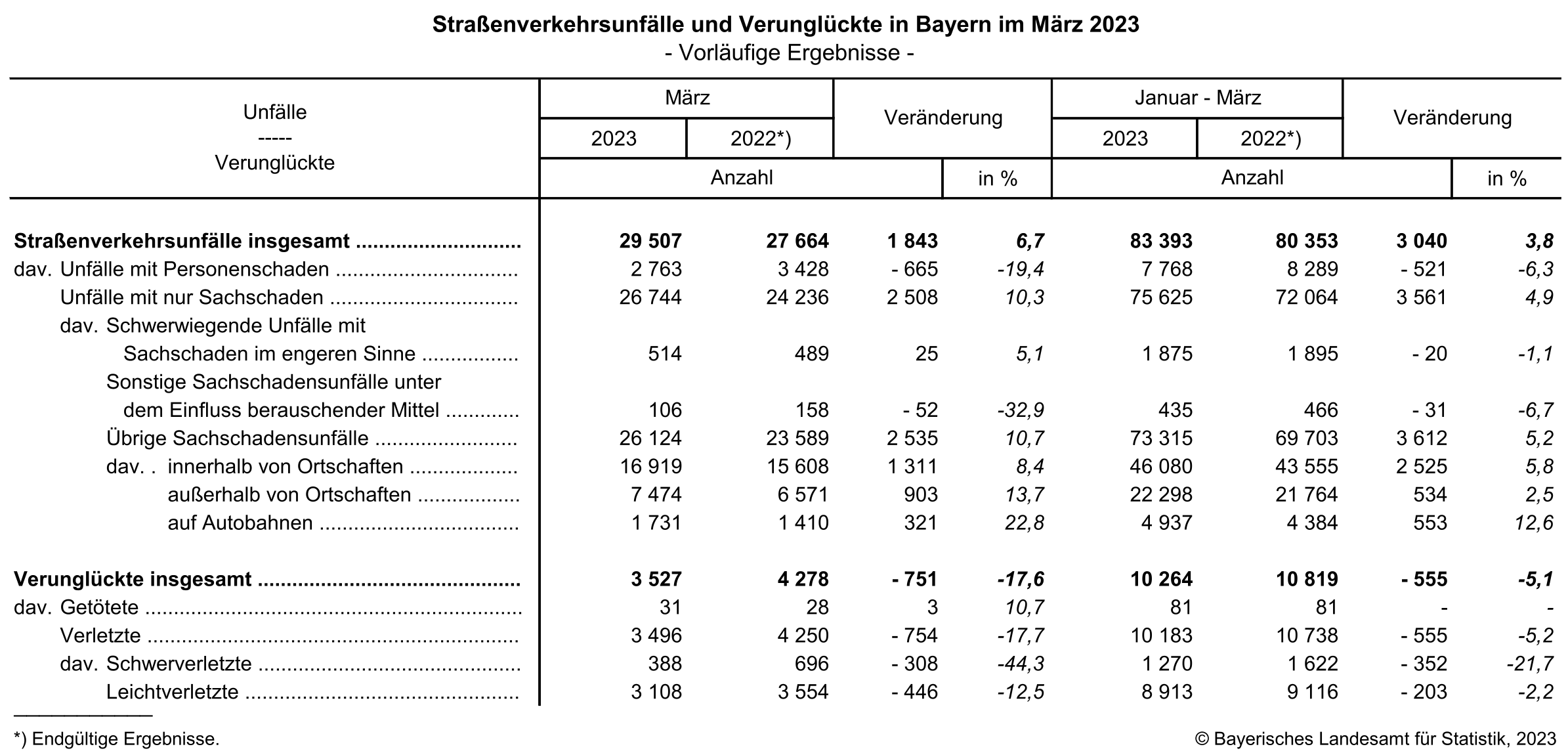 Im März 2023 ereigneten sich auf Bayerns Straßen nach den vorläufigen Meldungen der Polizei insgesamt 29 507 Unfälle und somit 6,7 Prozent mehr als im Vorjahresmonat. Nach Mitteilung des Bayerischen Landesamts für Statistik verunglückten dabei 3 527 Verkehrsteilnehmer insgesamt, 17,6 Prozent weniger als im März 2022. Es wurden 31 Menschen getötet (+10,7 Prozent), 388 schwer (-44,3 Prozent) und 3 108 leicht verletzt (-12,5 Prozent). Von Januar bis März 2023 stieg die Zahl der Straßenverkehrsunfälle gegenüber dem Vorjahreszeitraum um 3,8 Prozent auf 83 393 Unfälle. Die Zahl der Verunglückten ging, bezogen auf das erste Quartal, insgesamt um 5,1 Prozent zurück.