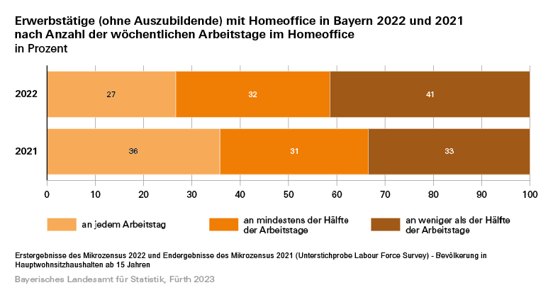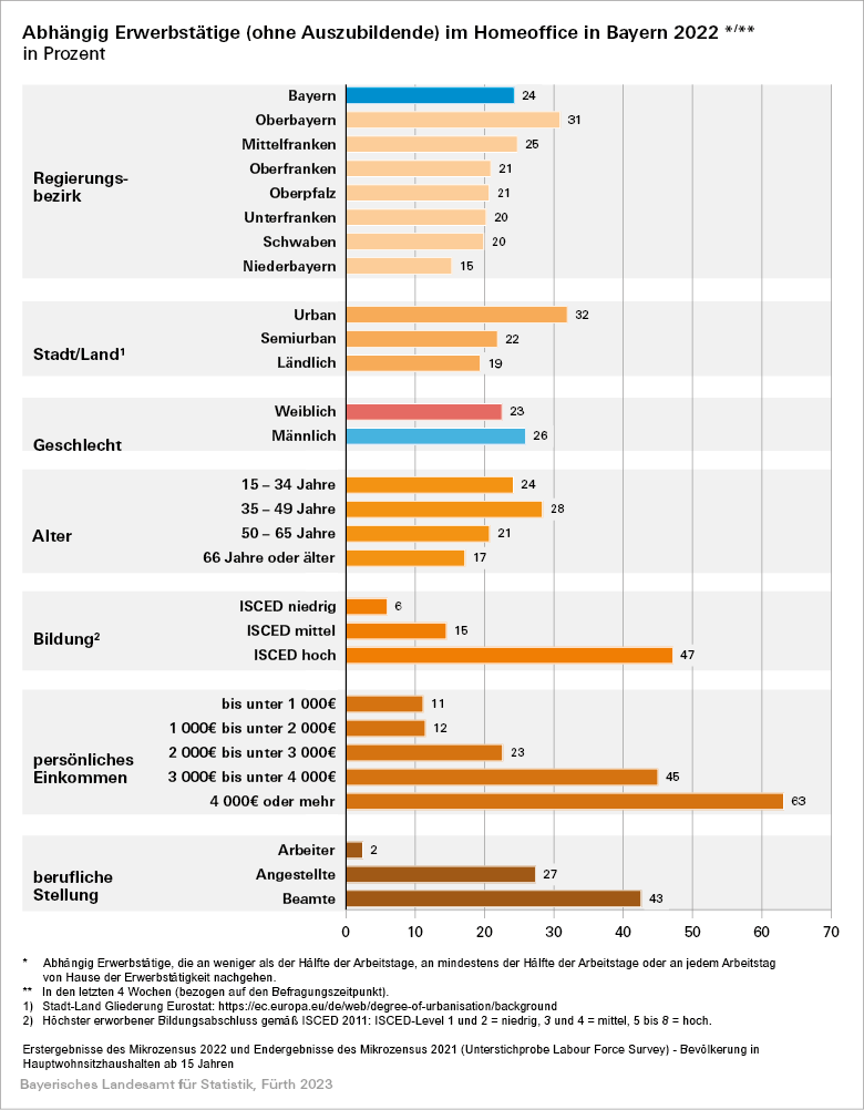 Nach Angaben des Bayerischen Landesamts für Statistik arbeiten im Jahr 2022 insgesamt rund 1,5 Millionen der knapp 6,2 Millionen abhängig Beschäftigten in Bayern mindestens einen Tag in der Woche von zu Hause aus. Bei Männern beträgt der Anteil 26 Prozent (alt: 27 Prozent), bei Frauen sind es rund 23 Prozent (alt: 22 Prozent).