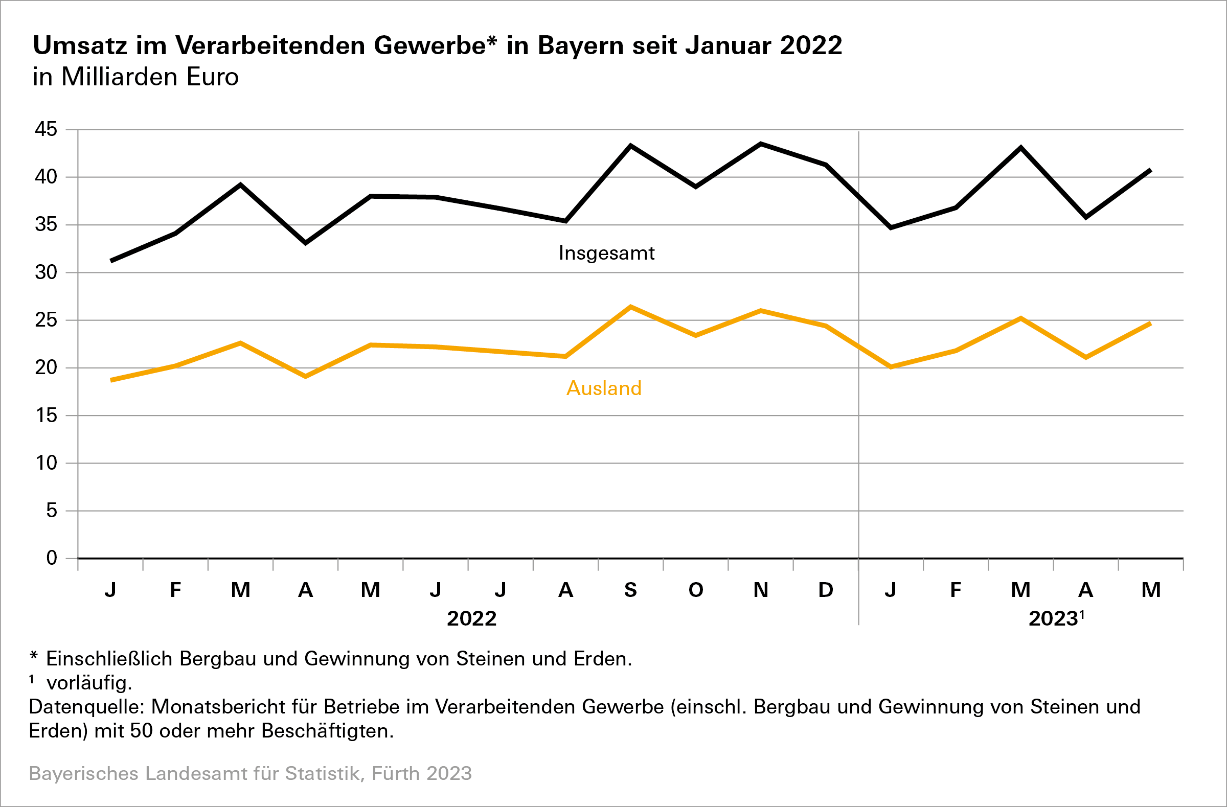 Das Verarbeitende Gewerbe Bayerns verzeichnet im Mai 2023 gegenüber dem Vorjahresmonat einen nominalen Umsatzzuwachs von 7,3 Prozent auf rund 40,8 Milliarden Euro. Nach Feststellung des Bayerischen Landesamts für Statistik nehmen die Auslandsumsätze dabei um 10,0 Prozent auf 24,7 Milliarden Euro zu. Die Exportquote beträgt 60,5 Prozent. Die Umsätze mit den Ländern der Eurozone steigen um 7,9 Prozent, ihr Anteil am Gesamtumsatz beläuft sich auf 19,0 Prozent. Die Nachfrage nach bayerischen Industriegütern nimmt preisbereinigt um 4,7 Prozent ab, der Personalstand erhöht sich um 1,8 Prozent.