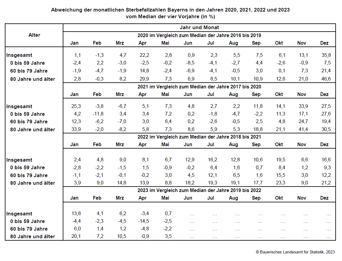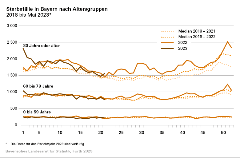 Fürth. Wie das Expertenteam des Bayerischen Landesamts für Statistik nach Auswertung vorläufiger Daten mitteilt, liegt die Zahl an Verstorbenen im Freistaat im Mai 2023 mit 11 288 Personen insgesamt auf ähnlichem Niveau wie der Median der Jahre 2019 bis 2022 (11 215 Verstorbene).