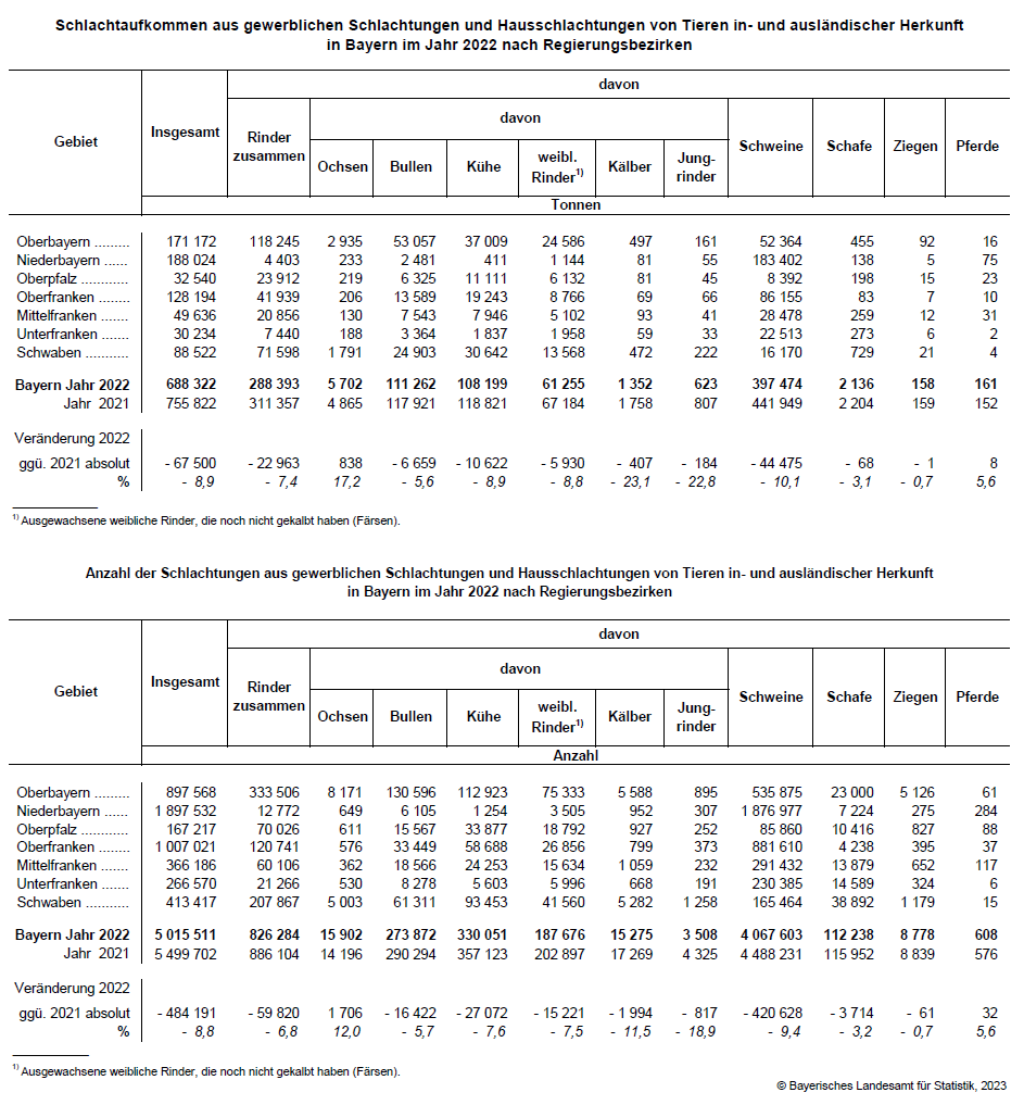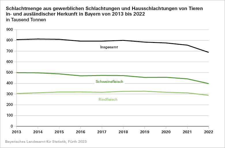 Die bayerische Fleischerzeugung (ohne Geflügelfleisch) in gewerblichen Schlachtbetrieben sowie durch Hausschlachtungen liegt im Jahr 2022 bei 688 300 Tonnen. Gegenüber dem Vorjahr bedeutet dies eine Abnahme um 8,9 Prozent bzw. 67 500 Tonnen. Maßgebend hierfür ist der Rückgang beim Schweinefleisch um 10,1 Prozent (- 44 500 Tonnen) auf 397 500 Tonnen sowie beim Rindfleisch um 7,4 Prozent (- 23 000 Tonnen) auf 288 400 Tonnen.