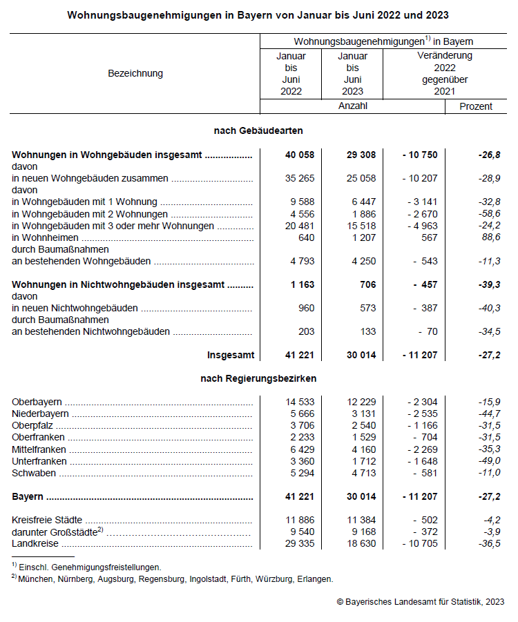 Rückgang der Wohnungsbaugenehmigungen in Bayern um 27,2 Prozent im ersten Halbjahr 2023