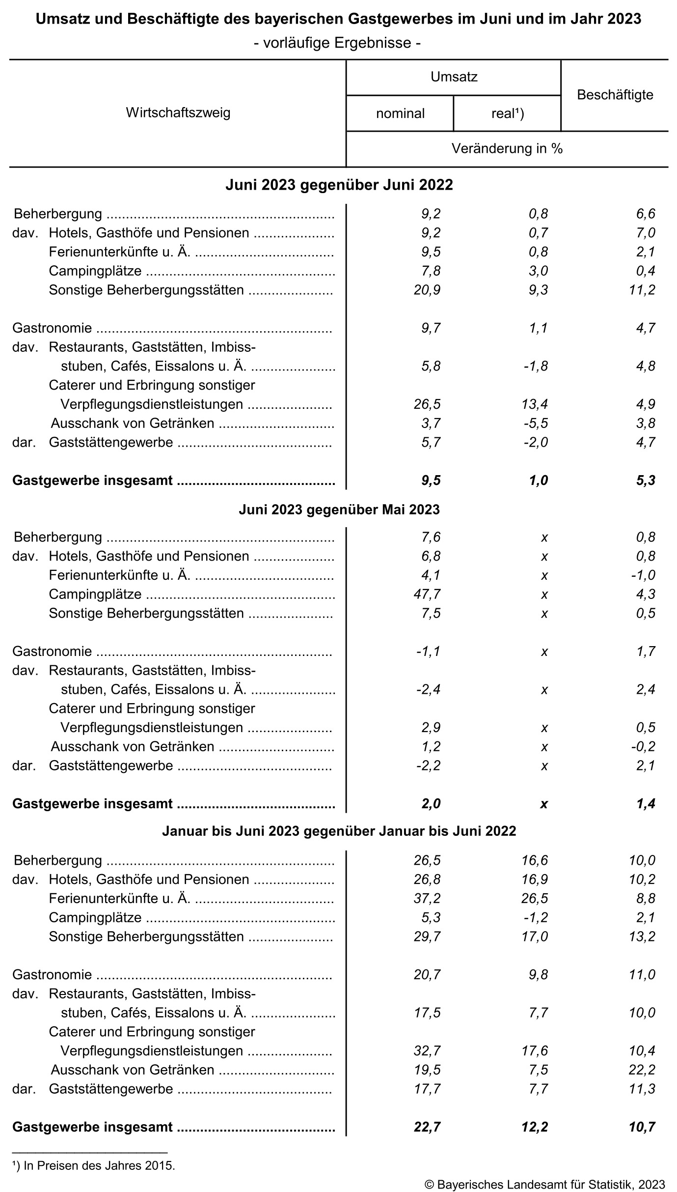 Wie das Bayerische Landesamt für Statistik nach den vorläufigen Ergebnissen der „Monatsstatistik im Gastgewerbe“ berichtet, steigt der Umsatz im bayerischen Gastgewerbe im ersten Halbjahr 2023 gegenüber dem Vorjahreszeitraum nominal um 22,7 Prozent und preisbereinigt um 12,2 Prozent. Auch die Beschäftigtenzahl wächst deutlich um 10,7 Prozent. Im Juni 2023 erhöht sich der nominale Umsatz im bayerischen Gastgewerbe verglichen zum Juni 2022 um 9,5 Prozent, der reale Umsatz lediglich um 1,0 Prozent. Die Zahl der Beschäftigten nimmt im Juni 2023 unterdessen um 5,3 Prozent zum Vorjahresmonat zu.
