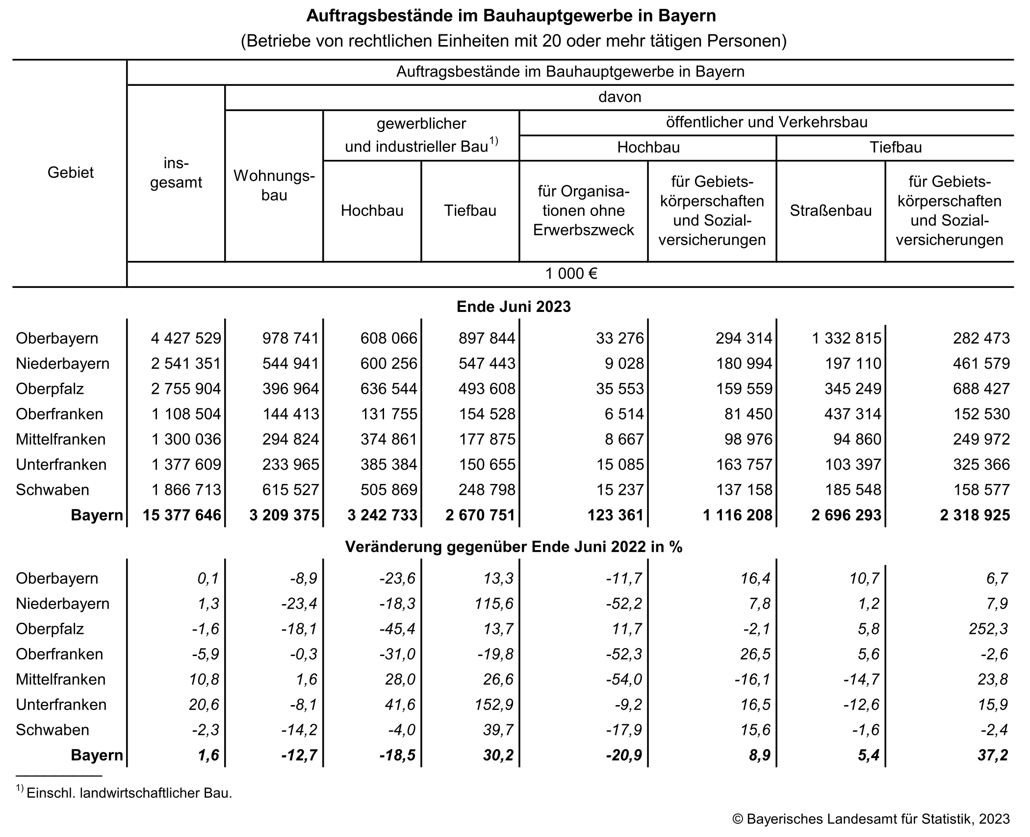 Gegenüber Ende Juni 2022 wächst der gesamte Auftragsbestand des bayerischen Bauhauptgewerbes nominal um 241,3 Millionen Euro beziehungsweise 1,6 Prozent. Mit Blick auf die bayerischen Regierungsbezirke sind für Mittelfranken und Unterfranken überdurchschnittliche Zuwachsraten im zweistelligen Bereich festzustellen. In den anderen Regierungsbezirken liegt die Veränderung des Bestands an geplanten, aber noch nicht abgearbeiteten Bauaufträgen unterhalb des bayerischen Durchschnitts.