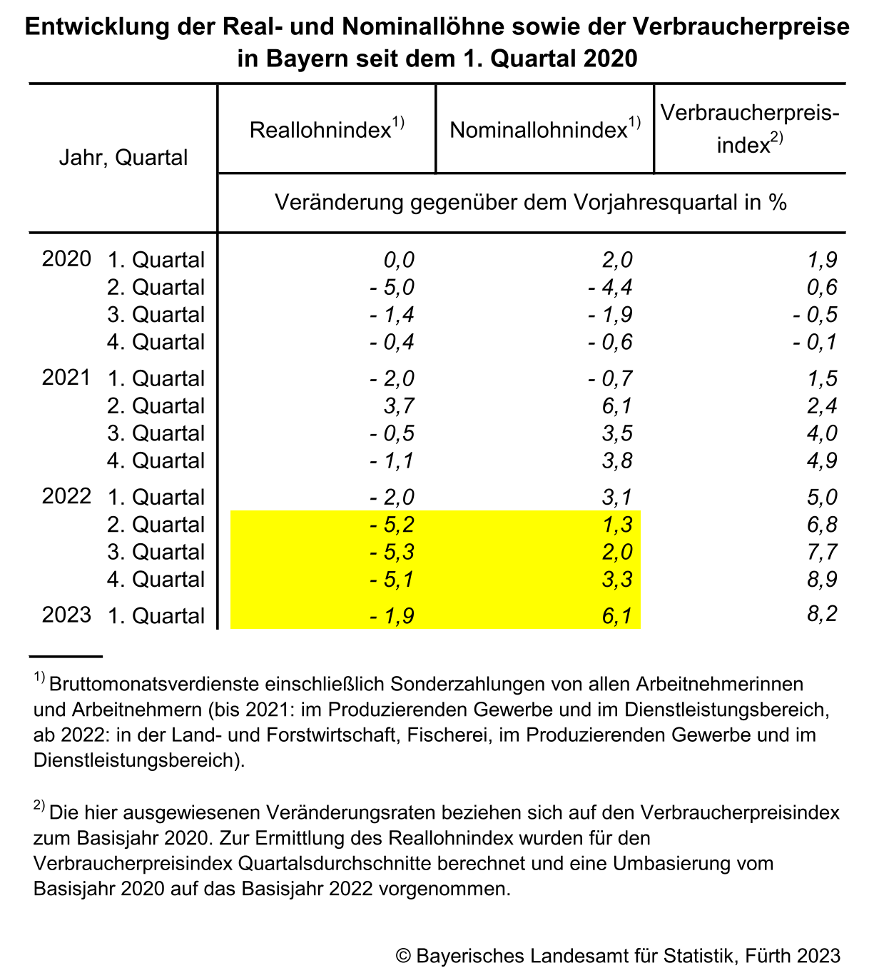 KORREKTUR zur Pressemitteilung Nr. 140 vom 5. Juni 2023: Bayerische Reallöhne sinken im ersten Quartal 2023 um 1,9 Prozent (alt: 2,1 Prozent)