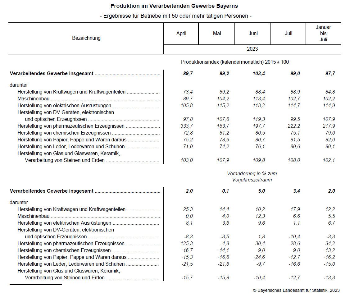 Nach Angaben des Bayerischen Landesamts für Statistik verzeichnet die Produktion des Verarbeitenden Gewerbes in Bayern im Juli 2023 gegenüber dem Vorjahresergebnis eine Zunahme von 3,4 Prozent. Diese ist hauptsächlich auf die Erhöhung des Produktionsvolumens bei Investitionsgütern (+9,5 Prozent) zurückzuführen. Die ersten sieben Monate des Jahres 2023 ergeben für die bayerische Industrie ein Plus von 2,0 Prozent. Vor allem die Pharmabranche steigert in diesem Zeitraum ihre Produktionstätigkeit deutlich.