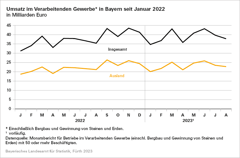 Das Verarbeitende Gewerbe Bayerns verzeichnet im August 2023 gegenüber dem Vorjahresmonat einen nominalen Umsatzzuwachs von 6,8 Prozent auf rund 37,8 Milliarden Euro. Nach Feststellung des Bayerischen Landesamts für Statistik nehmen die Auslandsumsätze dabei um 7,9 Prozent auf 22,8 Milliarden Euro zu. Die Exportquote beträgt 60,3 Prozent. Die Umsätze mit den Ländern der Eurozone steigen um 7,7 Prozent, ihr Anteil am Gesamtumsatz beläuft sich auf 17,3 Prozent. Die Nachfrage nach bayerischen Industriegütern steigt preisbereinigt um 1,3 Prozent, der Personalstand erhöht sich um 1,6 Prozent.