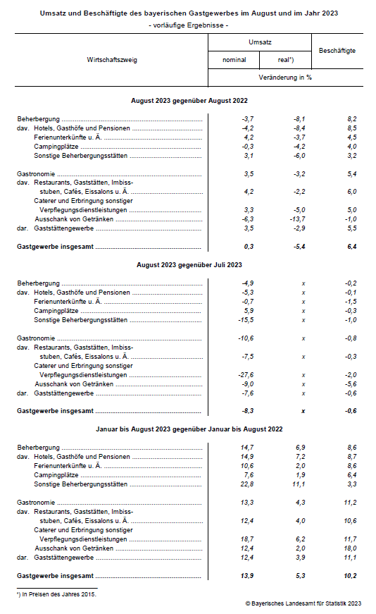 Von Januar bis August 2023 wächst der nominale Umsatz des Gastgewerbes in Bayern gegenüber dem Vorjahreszeitraum um 13,9 Prozent und der reale Umsatz um 5,3 Prozent. Die Zuwächse in der Beherbergung sind, mit einem nominalen Umsatz-zuwachs von 14,7 Prozent und einem realen Umsatzzuwachs von 6,9 Prozent, ähnlich hoch wie in der Gastronomie. In der Gastronomie steigt der nominale Umsatz um 13,3 Prozent und der reale Umsatz um 4,3 Prozent.