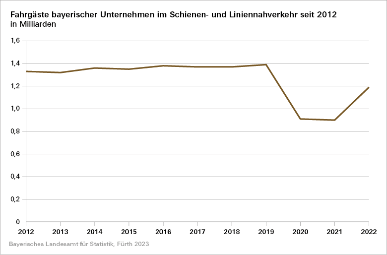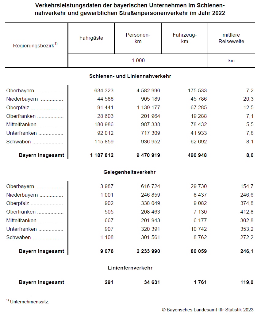 Mit rund 1,19 Milliarden Fahrgästen (+32,5 Prozent ggü. 2022) entfallen 99,2 Prozent des gesamten Fahrgastaufkommens 2022 auf den Liniennahverkehr mit Bussen und Bahnen (Entfernung bis etwa 50 km Fahrstrecke). Die bayerischen Unternehmen des Gelegenheitsverkehrs (Ausflugsfahrten, Ferienzielreisen, Mietomnibusverkehre) verbuchen mit knapp 9,1 Millionen Fahrgästen ein Plus von 138,6 Prozent. Der Linienfernverkehr (Fernbusse) zählt rund 291 000 Fahrgäste (+185,2 Prozent).
