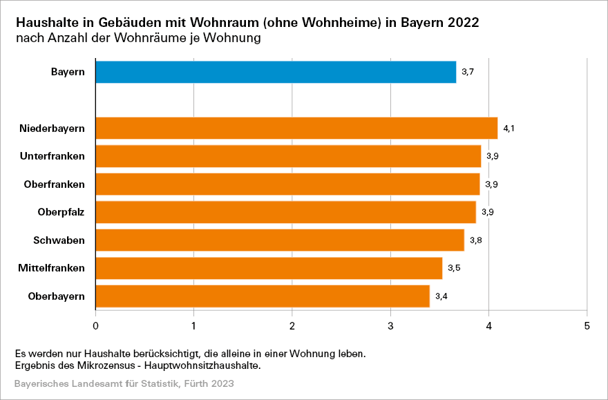 Bei der Betrachtung der Anzahl der Wohnräume zeigt sich folgendes Bild: Mit durchschnittlich 4,1 Wohnräumen je Haushalt fällt diese in Niederbayern am höchsten aus. Es folgen Unter-/Oberfranken sowie die Oberpfalz mit durchschnittlich 3,9 Wohnräumen. In Schwaben sind es durchschnittlich 3,8, in Mittelfranken 3,5 und in Oberbayern im Schnitt 3,4 Wohnräume.