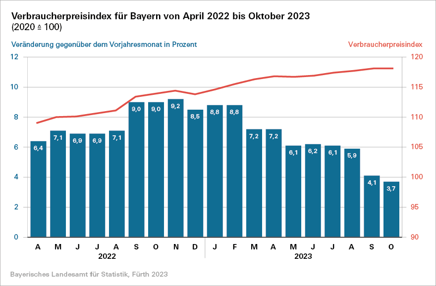 Die Inflationsrate, gemessen als prozentuale Veränderung des Verbraucherpreisindex für Bayern gegenüber dem entsprechenden Vorjahresmonat, liegt im Oktober 2023 bei 3,7 Prozent. Die Teuerungsrate des Gesamtindex ohne Nahrungsmittel und Energie, in der öffentlichen Diskussion oft als Kerninflationsrate bezeichnet, beläuft sich in diesem Monat auf 4,6 Prozent im Vergleich zum Vorjahresmonat.