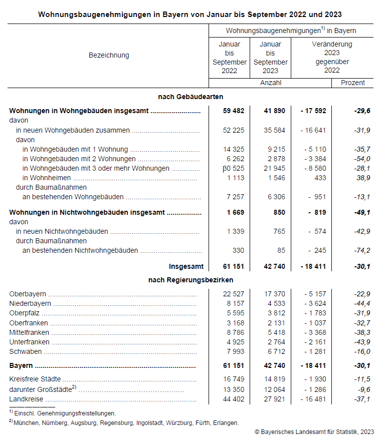 In den ersten drei Quartalen 2023 fallen die Wohnungsbaugenehmigungen im Freistaat gegenüber Januar bis September des Vorjahres um 18 411 Wohnungen; Niederbayern und Unterfranken verzeichnen den größten Rückgang