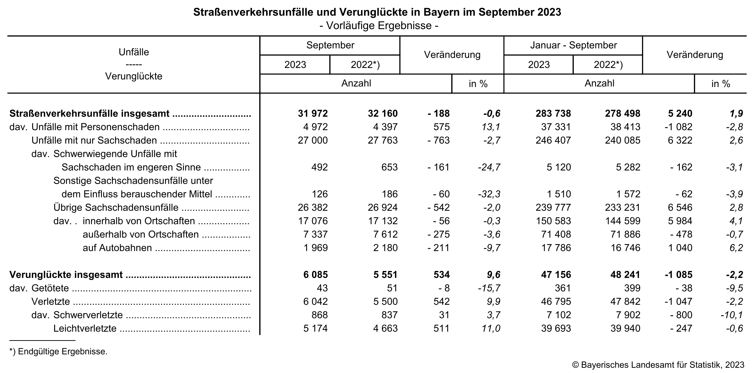 Straßenverkehrsunfälle und Verunglückte in bayern im September 2023