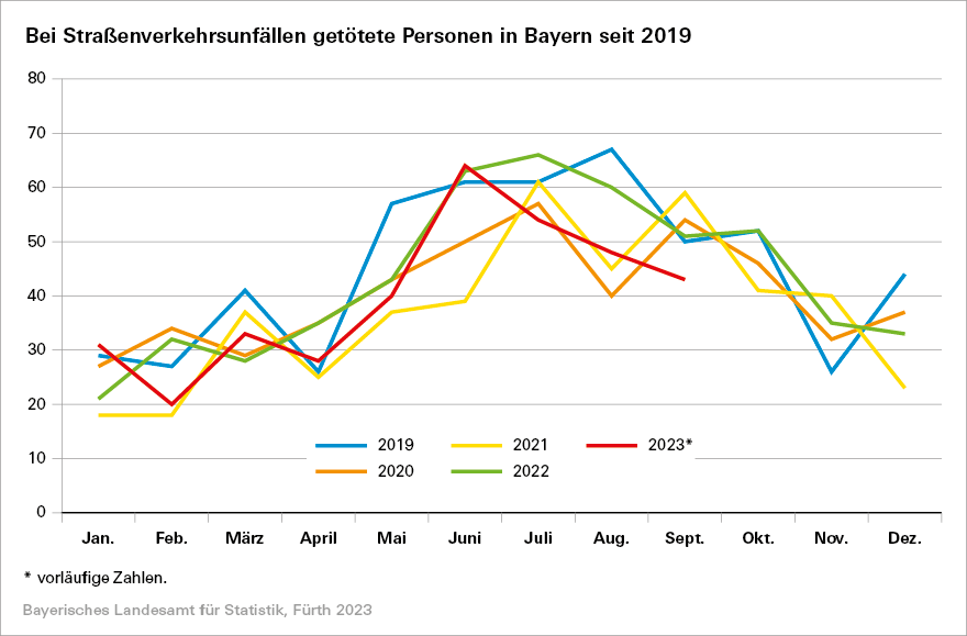 Ausführliche Ergebnisse wird der im Dezember 2023 erscheinende Statistische Bericht „Straßenverkehrsunfälle in Bayern im September 2023 (H1101C 202309)“ enthalten. Der Bericht kann im Internet als Datei kostenlos heruntergeladen werden. Weitere Informationen zum Bezug von Druckausgaben erhalten Sie beim Vertrieb per E-Mail (vertrieb@statistik.bayern.de), Telefon (0911 98208-6311) oder Fax (0911 98208-6638).
