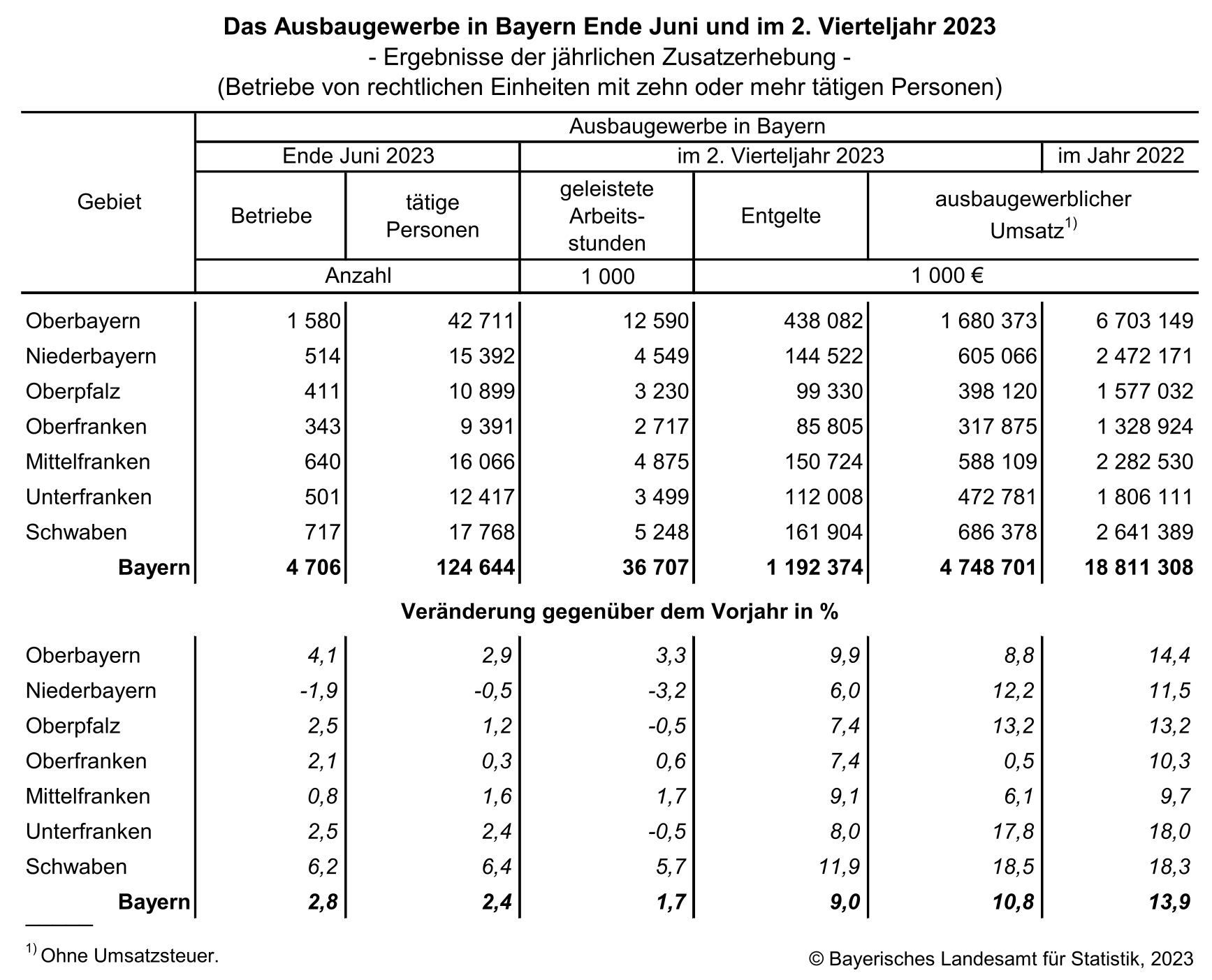 Nach den Ergebnissen der jüngsten betrieblichen Strukturerhebung im Ausbaugewerbe sind in Bayern Ende Juni 2023 insgesamt 4 706 ausbaugewerbliche Betriebe von rechtlichen Einheiten mit jeweils mindestens zehn tätigen Personen wirtschaftlich aktiv. In diesen Betrieben sind insgesamt 124 644 Personen beschäftigt. Gegenüber Ende Juni 2022 sind das 2,8 Prozent mehr Betriebe und 2,4 Prozent mehr tätige Personen. Der ausbaugewerbliche Umsatz beziffert sich im zweiten Quartal 2023 mit 4,75 Milliarden Euro insgesamt 10,8 Prozent im Plus. Von April bis Juni 2023 arbeiten die Beschäftigten im bayerischen Ausbaugewerbe zusammen 36,7 Millionen Stunden und erhalten dafür Entgelte in Höhe von insgesamt 1,19 Milliarden Euro. Gegenüber dem Vorjahresergebnis steigen die geleisteten Arbeitsstunden um 1,7 Prozent und die Entlohnung um 9,0 Prozent.